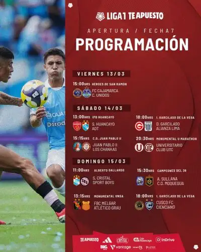 La pelea por los primeros lugares Torneo Apertura de la Liga 1 2026 se vuelve cada vez intensa y es por ello los 18 equipos se alistan a disputar esperada séptima fecha, que trae encuentro atractivos como el Universitario ante UTC; Alianza Lima frente al Garcilaso y Cristal contra el Sport Boys.