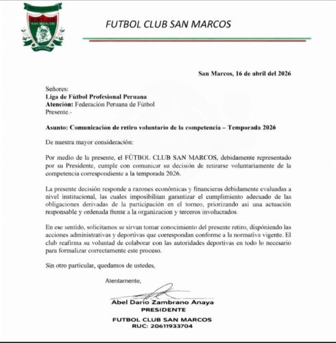 El FC San Marcos emitió un comunicado donde anunció su retiro voluntario de la presente temporada de la Liga 2, debido a problemas económicos y financieros que le impiden continuar con su participación en el torneo de ascenso.